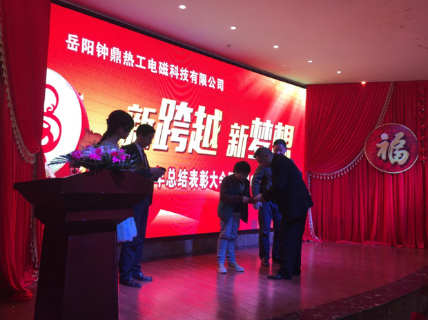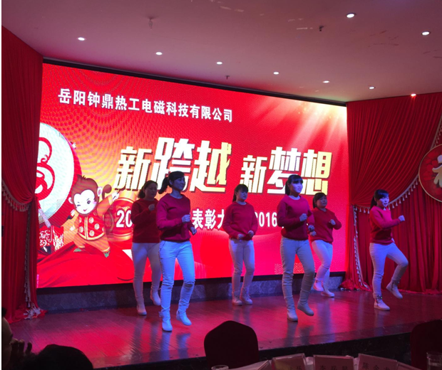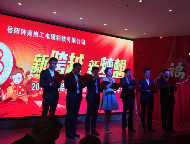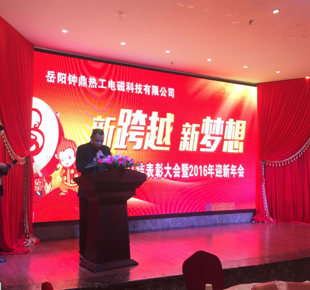 2016年2月3日岳陽鐘鼎熱工電磁科技有限公司2015年總結表彰大會暨2016年迎新年會在花板橋新大新酒店隆重舉行。鐘鼎熱工青年才俊們的開場詩朗誦《鐘靈毓秀、鼎盛未來》拉開年會的序幕,該詩篇講述了鐘鼎熱工創始人從創業到發展、到跨越升級的全過程,是一部非常勵志的史詩。